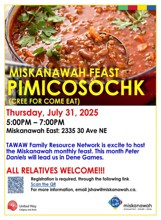 Pi Micosochk - Miskanawah Feast July 31, 2025 Thursday from 5 – 7PM Location: 2335 30 Ave NE Join Elders and Knowledge Keepers at a weekly feast at Miskanawah East – open invitation to all relatives! This month: Peter Daniels will lead us in Dene Games. All relatives welcome!! Registration is required. https://ow.ly/PkEq50Wvzfp (fb)