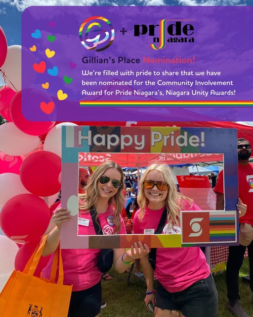 Gillian's Place has been nominated for a Community Involvement Award for Pride Niagara's, Niagara Unity Awards. 🌈 ✨ This award is for a group organization that has made a positive impact in helping or changing the 2SLGBTQ+ community of Niagara. To vote for GP, visit https://www.surveymonkey.com/r/PHQY8K6 (fb)