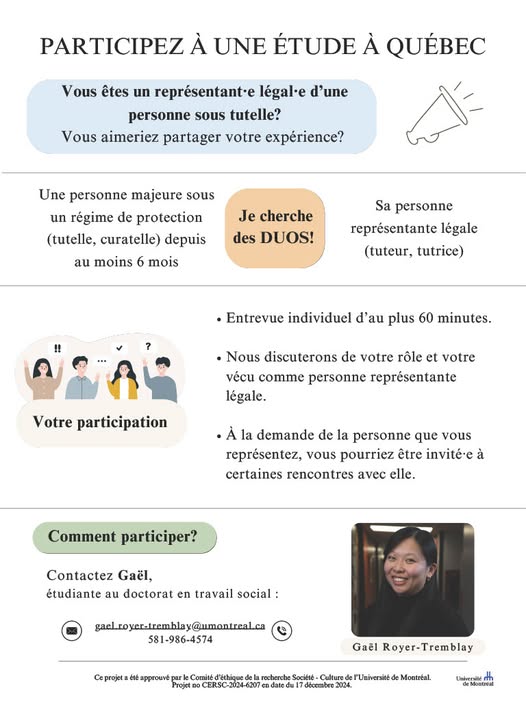 PROJET DE RECHERCHE - PERSONNES PARTICIPANTES RECHERCHÉES Vous êtes représentant·e légal·e d’une personne sous tutelle? Vous aimeriez partager votre expérience? Ce projet de recherche pourrait vous intéresser! 👉Pour participer ou pour obtenir plus d'informations, contactez Gaël Royer-Tremblay, étudiante au doctorat en travail social : 📧 : gael.royer-tremblay@umontreal.ca 📞 : 581-986-4574 (fb)