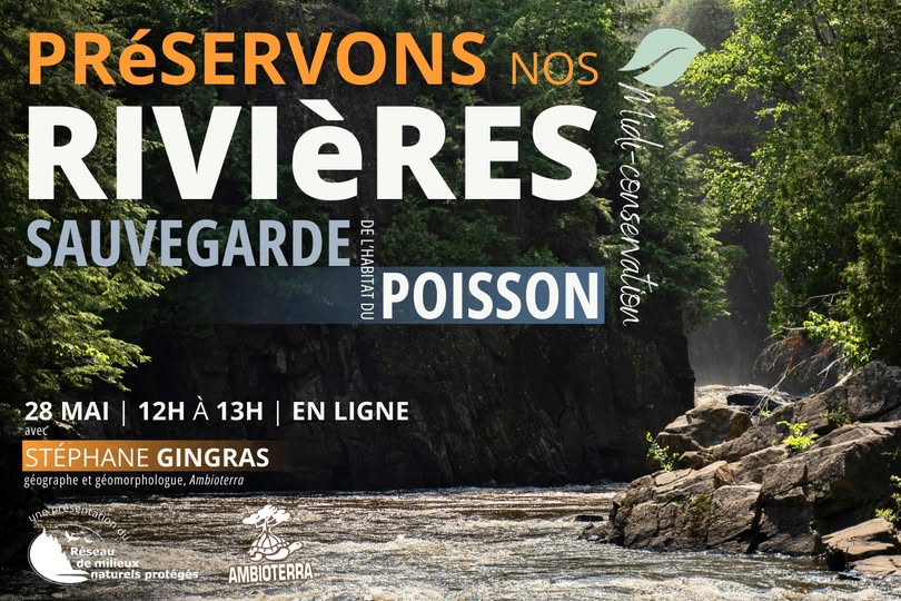RAPPEL : Midi-conservation | PRÉSERVONS NOS RIVIÈRES : SAUVEGARDE DE L’HABITAT DU POISSON Le Réseau de milieux naturels protégés organise les Midi-conservations et, le 28 mai, c’est Ambioterra qui sera à l’honneur. N’oubliez pas de vous inscrire ! Stéphane Gingras présentera un webinaire qui vous plongera au cœur de nos actions sur le thème de LA PRÉSERVATION DES RIVIÈRES ET DE L’HABITAT DU POISSON. Vous en apprendrez plus sur notre mission, ainsi que les actions et stratégies mises en œuvre pour atteindre cet objectif, réparties en trois volets : ➡️ Approche scientifique ➡️ Sensibilisation du public ➡️ Interventions concrètes sur le terrain Mercredi 28 mai 2025 De 12 h à 13 h EN LIGNE — GRATUIT et ouvert à toutes et tous Inscrivez-vous dès maintenant pour découvrir comment ensemble, nous pouvons préserver nos rivières: https://zoom.us/webinar/register/WN_TYAFY265SEqGqawkUSK62w#/registration #conference (fb)