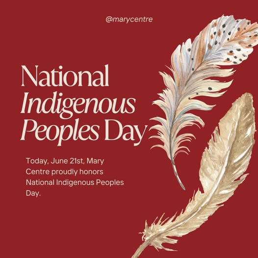 Today, June 21st, Mary Centre proudly honors National Indigenous Peoples Day. We celebrate the vibrant cultures, rich histories, and invaluable contributions of First Nations, Inuit, and Métis peoples across Canada. This day reminds us of the ongoing journey towards truth and reconciliation. At Mary Centre, we are committed to building inclusive communities for everyone. Let's all take time today to learn and reflect. (fb)