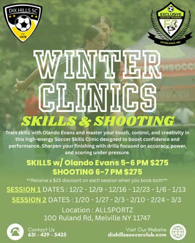 ⚽ Winter Clinics Kick Off This December! ⚽ Get ready to train with Olando Evans and take your game to the next level! 🔥 Our high-energy Skills & Shooting Clinics are designed to build confidence, boost performance, and sharpen your accuracy under pressure. 🗓️ Starting December 2 🕔 Skills: 5–6 PM | 💥 Shooting: 6–7 PM 📍 AllSportz, Melville, NY 💰 $275 per session (Save $25 when you book both!) Spots are limited — secure yours now and hit the ground running this winter! 👉 dixhillssoccerclub.com #DixHillsSC #WinterClinics #SkillsAndShooting #TrainWithOlandoEvans #SoccerTraining #WinterGrind #ComingThisDecember (fb)
