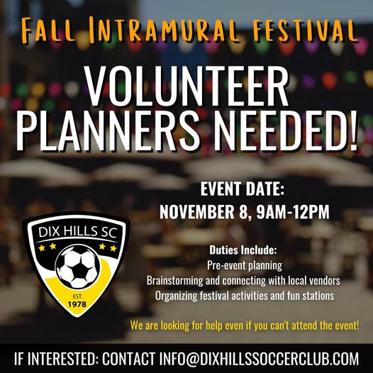 Help us make this year’s Fall Intramural Festival a hit! 🎉 We’re looking for Volunteer Planners to join the team and help with: ✨ Pre-event planning 🤝 Local vendor outreach 🎪 Organizing activities and fun stations 🗓️ Event: Nov 8, 9AM–12PM Can’t make the event? No problem — we still need your ideas! 📩 Contact info@dixhillssoccerclub.com (fb)