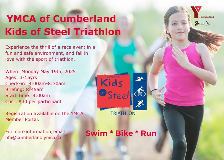 🚨Still time to sign up for this fun filled race event happening Monday... The YMCA of Cumberland, in collaboration with various community organizations, is excited to present the 2nd Kids of Steel Triathlon in Cumberland County. Join us for an exhilarating race experience in a fun and safe atmosphere, and discover your passion for the sport of triathlon. When: Monday May 19th, 2025 Ages: 3-15yrs Registration: 8:00am-8:45am Start Time: 9:00am Cost: $30 per participant Distances: (Pool / Bike / Run) 3-5yrs: 1 Width/ 350M / 110M 6-7yrs: 25M/ 1.2KM / 500M 8-9yrs: 75M / 3KM/ 900M 10+yrs: 100M / 4K / 1.5K Please note: Bring your own bike / life jackets available Register online on the YMCA Member Portal For more information, email: hfa@cumberland.ymca.ca (fb)