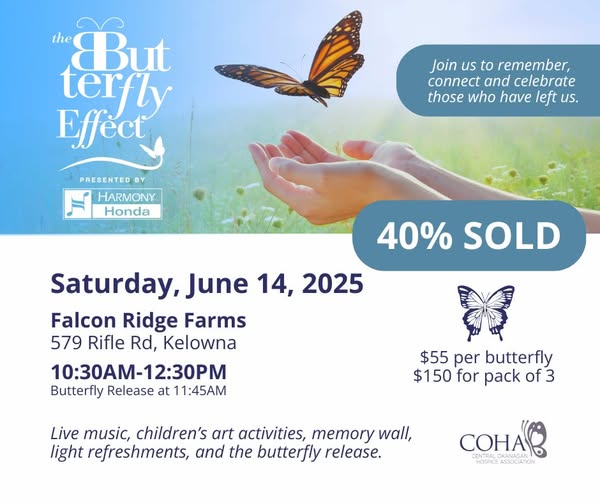 We’re 40% sold! Butterflies for The Butterfly Effect, presented by Harmony Honda, are going fast. This meaningful event takes place on Saturday, June 14, 2025 — and butterflies are in limited supply. Each butterfly release is a touching moment of reflection, remembrance, and hope. We invite you to join us in honouring those we've lost and letting your love take flight. Reserve your butterfly today: hospicecoha.org/butterfly-effect-2025 #TheButterflyEffect #COHA #KelownaEvents #Remembrance #ButterflyRelease (fb)