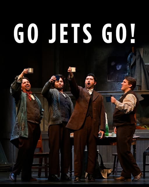 Tonight, the Winnipeg Jets take centre stage — and we’re singing their praises all the way to victory! 💙🏒 We know a thing or two about drama, passion, and show-stopping finales... and we can’t wait to see the Jets deliver another big win tonight! Hit those high notes and bring home the bravo! ✨🎭 #GoJetsGo #WinnipegProud 📸: Hugo Laporte (Marcello), Alex Halliday (Colline), Clarence Frazer (Schaunard), and Zachary Rioux (Rodolfo), La Bohème, 2025. Photo: R. Tinker (fb)