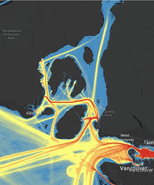 An interesting "heat map" of AIS equipped vessel traffic in Howe Sound and English Bay. Did you contribute to any of these tracks? We certainly did! (fb)