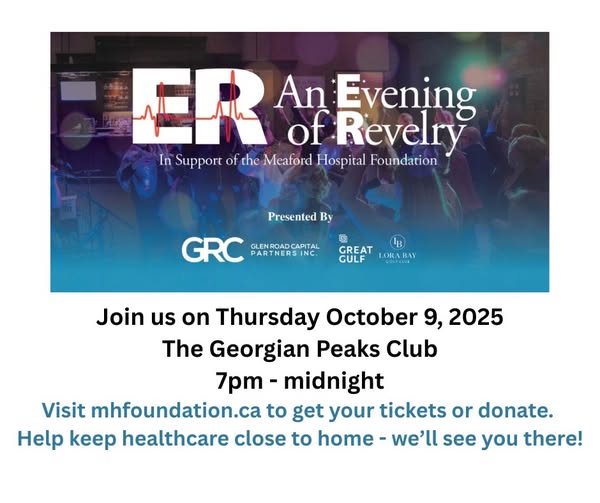 Get ready for a night to remember! On Thursday, October 9th, join us at the stunning Georgian Peaks Club for the 2nd annual ER: An Evening of Revelry—supporting the Meaford Hospital Foundation. This unforgettable cocktail party will help fund vital renovations to the Brightshores Meaford Hospital emergency department, which saw over 14,000 visits last year—and our community keeps growing! Enjoy gourmet food, an open bar, a curated silent auction, and dance the night away. Shuttle service included! Visit mhfoundation.ca to get your tickets or donate. Let’s make a difference—together! (fb)