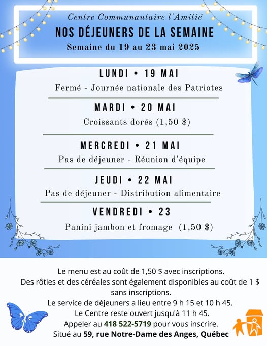 Bonjour ! Voici le menu des déjeuners de la semaine prochaine, soit du 19 au 23 mai inclusivement. À noter que nous serons fermé lundi le 19 mai toute la journée en raison de la Journée nationale des Patriotes. Au plaisir ! (fb)