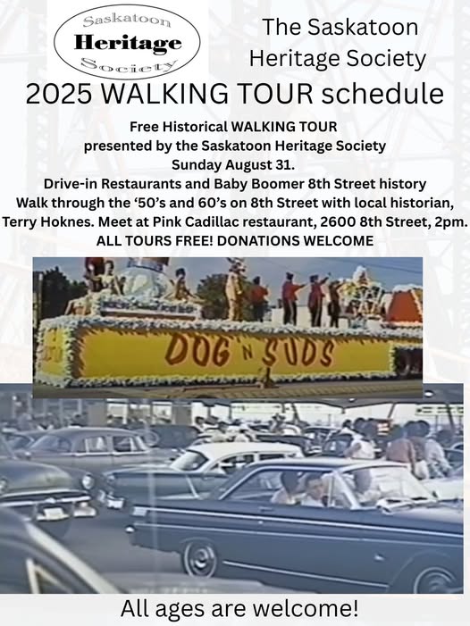 Free Historical WALKING TOUR presented by the Saskatoon Heritage Society Sunday August 31. Drive-in Restaurants and Baby Boomer 8th Street history Walk through the ‘50’s and 60’s on 8th Street with local historian, Terry Hoknes. Meet at Pink Cadillac restaurant, 2600 8th Street, 2pm. ALL TOURS FREE! DONATIONS WELCOME (fb)