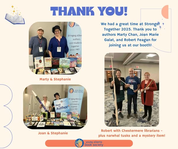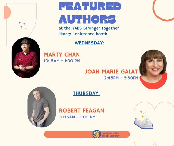 We have an addition to our Alberta Stronger Together Conference booth! Author Joan Marie Galat⭐ will be joining us at 2:45pm! Marty Chan, Author 🧠 is here until 1pm and tomorrow morning we'll have Robert Feagan Author 🥍 Come say hi! #strongertogether2025 #AlbertaLibraries (fb)