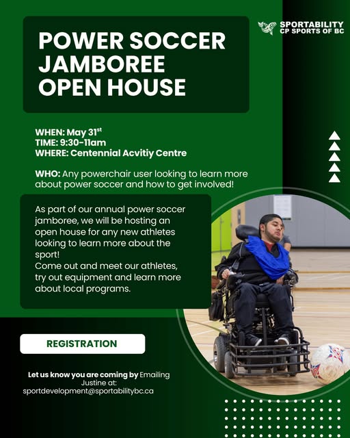 What better way to celebrate accessibility week than trying a new sport? Come give Power Soccer a try at the Power Soccer Jamboree Open House in Coquitlam, BC! This is a great opportunity to try a new sport in a fun and recreational environment. Equipment, snacks and prizes will be provided. Stick around after to watch the pros play a few exhibition games! E-mail Justine at sportdevelopment@sportabilitybc.ca to confirm your attendance. Thanks to our partners at the City of Coquitlam - Municipality for supporting this event. (fb)