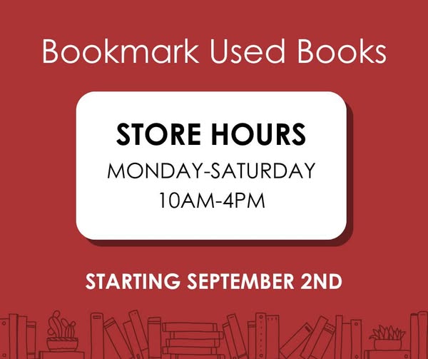 Starting September 2nd Bookmark Used Books' store hours will be 10am-4pm Monday-Saturday. Feed your need to read - visit Bookmark - our used bookstore (fb)