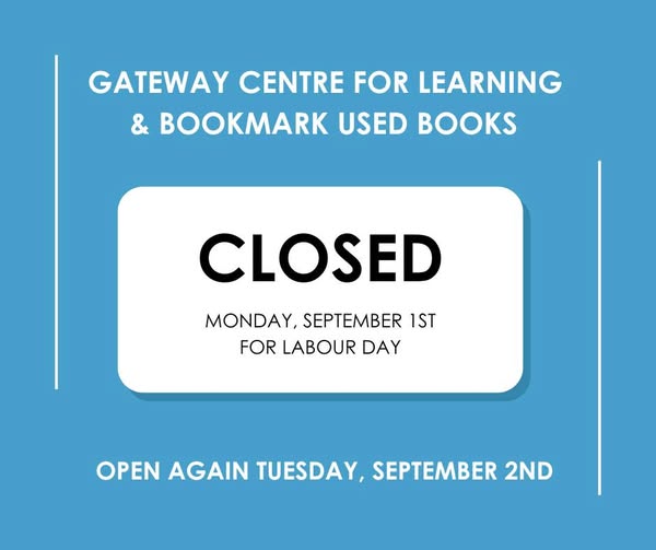 Gateway Centre for Learning and Bookmark Used Books will be closed on Monday, September 1st for Labour Day. We will be open again Tuesday, September 2nd during our regular business hours. Have a great long weekend! (fb)