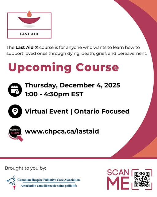 Ready to gain essential skills in end-of-life care? Sign up for a Last Aid® course! This 3-hour course, broken into 4, 45-minute sections, is designed for everyone who wants to learn how to support and care for those close to them during dying, death, grief, and bereavement. On December 4th, facilitators Linda Hochstetler and Julie McIntyre are hosting a session with information specific to the province of Ontario. Participants will receive a certificate upon completion. Spaces are limited and sell out fast, so secure your spot now at https://loom.ly/cWSSvXI. #LastAidCanada (fb)