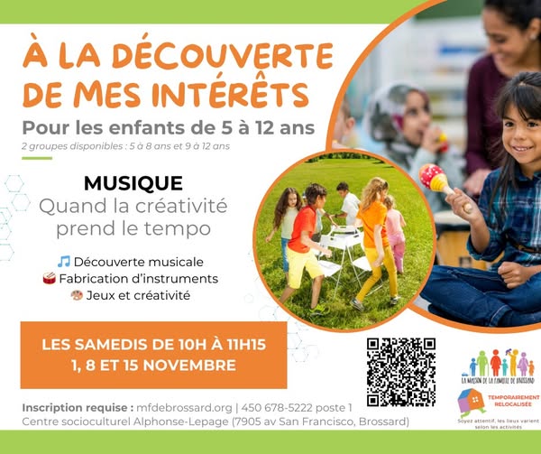🎶 À la découverte de mes intérêts | Musique 🎵 Quand la créativité prend le tempo ! Votre enfant aime bouger, chanter ou simplement faire du bruit ? 😄 Cet atelier est fait pour lui ! Au fil de 3 rencontres ludiques (1, 8 et 15 novembre), les enfants exploreront l’univers de la musique à travers des activités dynamiques et créatives. 🎨 Au programme : • Découverte de différents concepts musicaux • Fabrication d’instruments maison • Jeux rythmiques et amusants pour mettre leurs nouvelles connaissances en pratique 👧👦 Deux groupes : 5 à 8 ans et 9 à 12 ans 🕙 Horaire : 10 h à 11 h 30 Un atelier pour apprendre, créer et s’amuser au rythme de la musique ! 🎵💫 👉 Inscription dès maintenant sur notre site : https://www.mfdebrossard.org/calendrier/a-la-decouverte-de-mes-interets-musique-quand-la-creativite-prend-le-tempo/ (fb)
