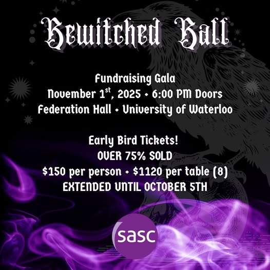 🔮 Bewitched Ball 🔮 Earlybird Pricing Extended Until October 5th! A Fundraising Gala for The Sexual Assault Support Centre of Waterloo Region 📅 Saturday, November 1, 2025 🕕 Doors at 6:00 p.m. 📍Federation Hall, University of Waterloo 200 University Avenue West (Ring Road - Building 35, R Lot) Waterloo, Ontario Tickets: https://can.givergy.com/sascgala2025/?controller=tickets Single: $150 Table (8 seats): $1120 Tickets include access to: - An evening of fun hosted by award-winning broadcaster, Robin Farrell - Themed Entertainment - Seated Dinner - DJ & Dance - Live and Silent Auction And more! We aim to raise $60,000 to support the highest needs of our organization as we adjust to increased levels of services for survivors in Waterloo Region. If you have any questions, let us know. We hope to see you there! #Gala #Fundraiser #WaterlooRegion (fb)