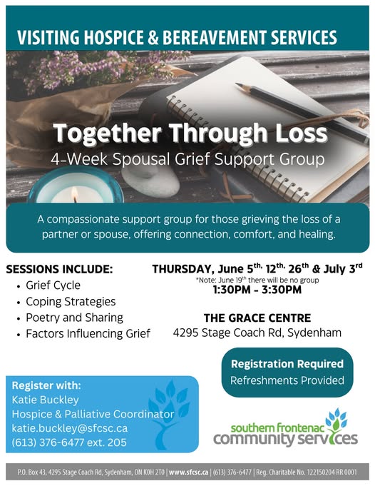Losing a partner changes everything. If you're navigating the pain of spousal loss, you're not alone. Join us for Together Through Loss, a closed 4-week support group starting Thursday, June 5. This group offers a safe and compassionate space to share, heal, and connect with others who truly understand. To register or learn more, please contact Katie at katie.buckley@sfcsc.ca. You don’t have to walk through grief alone. Let’s take these steps forward, together. 💛 (fb)