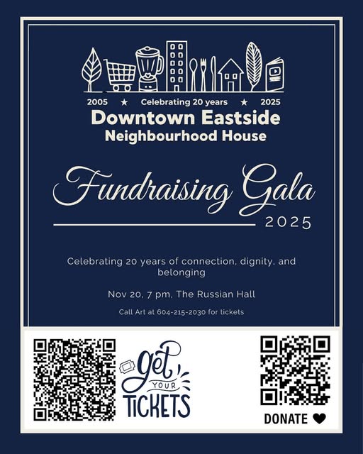 🌟 Just a few weeks away! 🌟 On November 20, we’ll gather to celebrate 20 years of connection, dignity, and belonging in the Downtown Eastside. 💛 A night to give thanks, share stories, and look toward the future of our House. ✨ Celebrating 20 years | 庆祝20周年 | جشن ۲۰ ساله | نحتفل بمرور 20 عامًا | ¡Celebrando 20 años! | 慶祝二十週年 ✨ 📍 The Russian Hall – 600 Campbell Ave 🕖 Thursday, Nov 20 | 7:00–10:00 PM 💛 Tickets: $75 | Includes dinner & entertainment #DTESNH20 #Community #Belonging #DowntownEastside #FundraisingGala (fb)