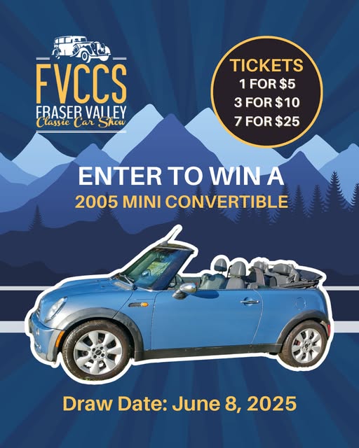 Enter to win a 2005 Mini Cooper Convertible from the Fraser Valley Classic Car Show. Every ticket purchased will go to support Chilliwack General Hospital! Come check out the car in person today at Chilliwack General Hospital! It’ll be on display until noon – don’t miss your chance to see what you could win! 🎟 Tickets: 1 for $5 | 3 for $10 | 7 for $25 📍 Draw Date: June 8, 2025 📍 Location: UFV Education Park, Chilliwack 💻 Buy online at https://fvccs.rafflenexus.com Must be 19+ to enter. Know your limit, play within it. BC Gaming Licence #160880 (fb)
