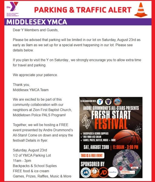 Middlesex YMCA Parking Alert for Saturday, August 23rd. https://conta.cc/4fOermh (fb)