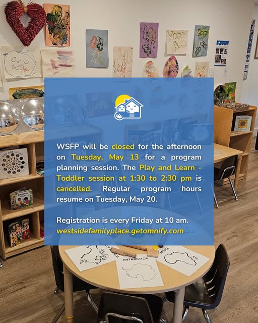 WSFP will be CLOSED for the afternoon on Tuesday, May 13 for a program planning session. The Play and Learn - Toddler session at 1:30 to 2:30 pm is cancelled. Regular program hours resume on Tuesday, May 20. (fb)