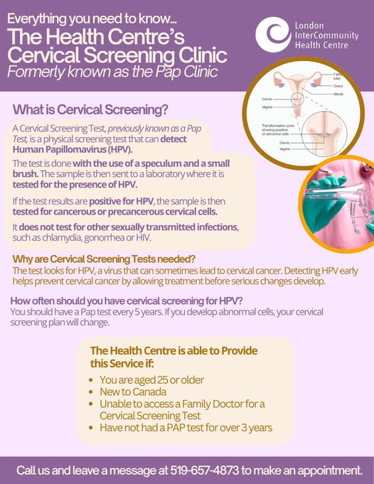 Did you know the Health Centre offers a Cervical Screening Clinic for those who meet certain eligibility criteria? Cervical screening helps detect HPV and prevent cervical cancer through early intervention. This service is available to those aged 25 or older, new to Canada, without access to a family doctor for screening, or who haven’t had a Pap test in over three years. Call 519-657-4873 to leave a message and book your appointment. (fb)