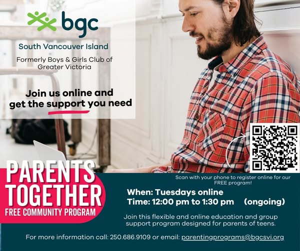 Looking for some ongoing support with parenting a teen? We offer a FREE Parents Together community program available online! This is a program to help parents and teens grow together in a supportive community group. Scan the QR code on the image to register online. Where: online only When: Tuesdays Time: 12 pm - 1:30 pm (online) Support with topics that can include: ✔️Attachment and relationship-based practices ✔️Communication and 6 critical messages ✔️Developmental changes in pre-adolescence ✔️Adolescent brain development ✔️Boundaries, and turning over responsibility as appropriate ✔️Self-care – taking back your life ✔️Adolescent mental health ✔️Substance use and teens ☎️250.686.9109 ✉️parentingprograms@bgcsvi.org #bgcsvi #parentsintheknow #parentingprogram #parentswithteens (fb)