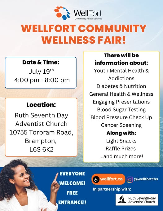 Join us in #Brampton for the Our WellFort Community Wellness Fair in partnership with Ruth Seventh-day Adventist Church! FREE health checks like Blood Sugar Testing & Blood Pressure Screening, Engaging Presentations on Mental Health & Addictions, Informative Wellness & Community Resources on Cancer, Diabetes and Hypertension. Resources from Local Community Agencies and Organizations, Delish Snacks, Great Activities for Everyone and Raffle Prizes!! Saturday July 19 at 10755 Torbram Rd, Brampton from 4 p.m. - 8 p.m. Don't miss out, See you there! #healthfair #wellnessfair #brampton #communityfair #ruthseventhdayadventistchurch (fb)