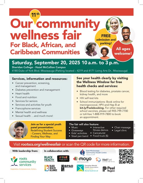 Saturday, Sept 20 in Mississauga! Join us for the Our Community Wellness Fair for Black, African, and Caribbean Communities at Sheridan College - Hazel McCallion Campus - 4180 Duke of York Blvd., Mississauga. Take part in free health checks, get wellness information and resources, and chat with local wellness service providers. There will also be music, giveaways, chair massages, a legal clinic, and much more. Lots of activities for kids including a kids table, caricaturist, and fitness demonstrations. The event will also feature a special youth panel discussion: Reimagining Student Success – Careers, Wellness, and Finding Your Way. FREE screening for diabetes by @wellfortchs , prostate cancer, cholesterol, blood pressure screenings and more will be available along with school immunizations. Admission and parking are free and all ages are welcome! Hope to see you there! More info at www.rootscs.org/wellnessfair Make it a full day of cultural celebrations by also visiting AfroCan - Roots & Rhythms Fest, happening Sept. 20 just down the road at Celebration Square in Mississauga. (fb)