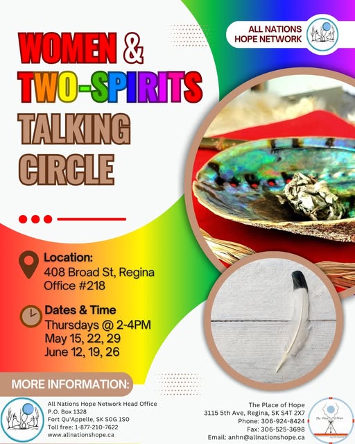 All Nations Hope Network is having Women & Two-Spirit Talking Circles. Date & Time: Thursdays from 2 - 4PM May 15, 22, 29 June 12, 19, 26 Location: 408 Broad Street, Regina Room #218 In this 2-hour talking circle, there will be topics of ceremony, Indigenous cultures, harm reduction, two spirit, gender-based violence, discriminations, intersectionality, how we can care for each other, and much more. If you identify as a woman, two spirit, or you have a relative who is part of the 2SLGBTQ+ who you are caring for, you are welcome to join in this old tradition of coming together to talk. If you have additional questions, please contact us at 306-924-8424. #2SLGBTQIA #reginapride #indigenousculture #talkingcircle #supportgroup #yqr #WomenandTwoSpirit #Women #twospirit #2SLGBTQFamily #Ally #queercommunity (fb)