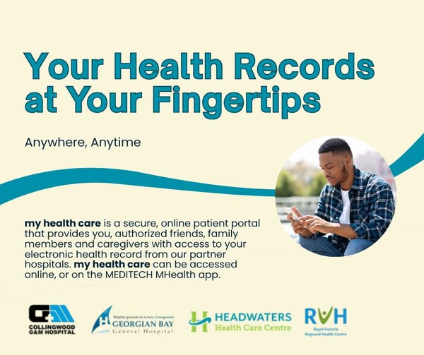 You can view your appointment results and your health record - anywhere, anytime! 📱💻 my health care is a secure, online patient portal that provides you, authorized friends, family members and caregivers with access to your electronic health record from our partner hospitals. my health care can be accessed online, or on the MEDITECH MHealth app. Learn more: https://www.headwatershealth.ca/patients-and-visitors/health-records/myhealth-care-patient-portal/ (fb)