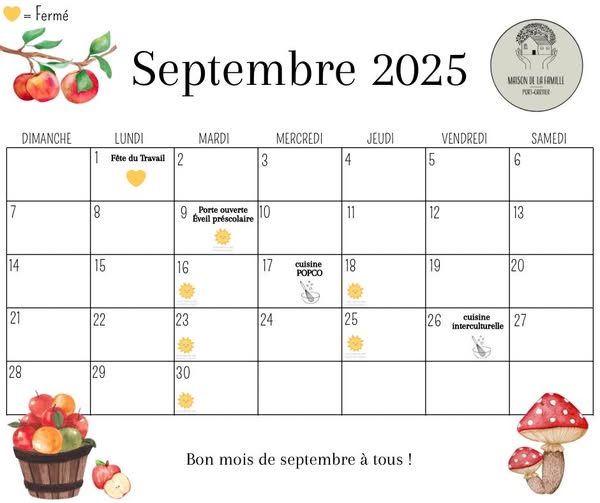🍎SEPTEMBRE🍎 Voici notre calendrier d'activités pour le mois de septembre. Notre halte-garderie est ouverte depuis ce mardi 2 septembre, vous pouvez donc nous téléphoner pour réserver votre place. 🧑🧑🧒🧒 Pour inscription ou information sur nos différentes activités, veuillez nous contacter via Messenger ou au (418) 766-8666 poste 0. Prendre note que d'autres activités comme nos différentes cuisines et notre café-rencontre seront de retour très bientôt !! 🥰 Bonne après-midi à tous ! (fb)