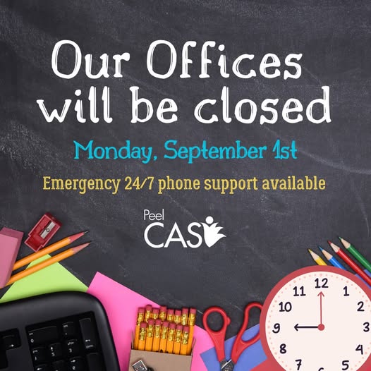 Please note, our offices will be closed Monday, September 1 for Labour Day. We will re-open on Tuesday, September 2, resuming our regular business hours from 9am to 5pm. Emergency phone support is available 24/7. If you are concerned for the well-being of a child or youth, please 📞905-363-6131 (fb)