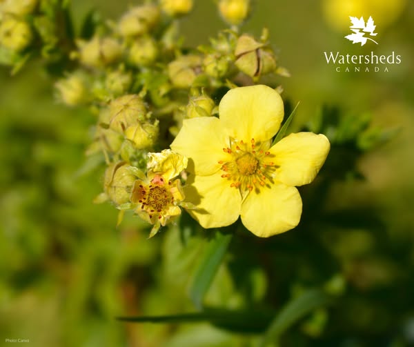Species Spotlight: Shrubby Cinquefoil (Dasiphora fruticosa) Shrubby Cinquefoil is a hardy deciduous shrub in the Rosaceae (rose) family. It is found throughout North America. Shrubby Cinquefoil grows up to 1m tall and has greenish-blue, narrow, and elliptical leaves. Similar to Ninebark, its stems start to appear shredded as it ages. Shrubby cinquefoil blooms from June to September with yellow five-petaled flowers in small clusters on terminal branches. Its flowers are beneficial to pollinators. Come fall, these flowers give way to inedible oval-shaped brown fruit similar to a dried strawberry. Shrubby Cinquefoil is commonly fed on by herbivores including rabbits and deer, so protective measures to ensure survival are encouraged if they are planted. Learn more: https://naturaledge.watersheds.ca/plants/shrubby-cinquefoil/ (fb)