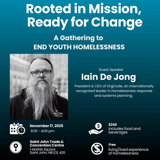 FEATURED SPEAKER: Iain De Jong With decades of experience in homelessness systems planning, training, and frontline support, Iain has led transformations in communities across Canada and the U.S. Hear him LIVE in Saint John on November 17, 2025 at our conference to end youth homelessness. Rooted in Mission, Ready for Change: A Gathering to End Youth Homelessness is a full-day conference with practical tools, workshops, and networking opportunities. Save your seat today! https://youthimpact.org/EndYouthHomelessness #RootedInMission #EndYouthHomelessness #BuildFoundationsEmpowerYouth #PoweredByYouthImpact #CentreForYouthCare (fb)