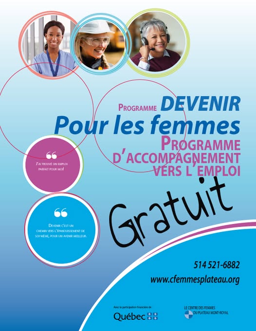 Le Centre des femmes du PlateauMontRoyal Nous oeuvrons a lamelioration des conditions de vie des femmes Flash Info DEVENIR Programme daccompagnement vers lemploi A qui la chance . Cest gratuit . Voici nos prochaines dates. Printemps 2025 Du 14 avril au 27 juin 2025 Duree 11 semaines12 participantes par groupe Contacteznous au 514 5216882 devenircfemmesplateau.
