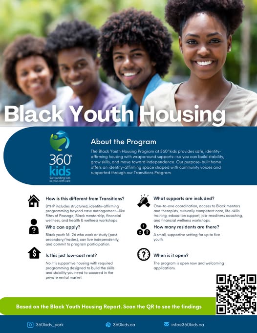 🏠 Black Youth Housing at 360°kids Providing safe, identity-affirming housing with wraparound supports so youth can build stability, grow skills, and move toward independence. ✅ Open now and welcoming applications ✅ Supportive home for up to five youth ✅ Access to Black mentors, culturally competent care, life-skills training, education support, and more Learn more and apply today at 360kids.ca 📩 info@360kids.ca | 📱 @360kids_york (fb)