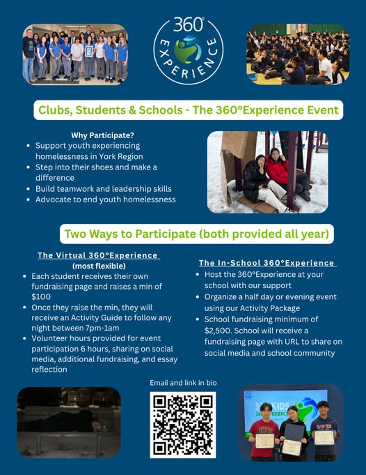 🏫Schools & students - get involved! The 360°Experience helps students explore the realities of youth homelessness through the Virtual Experience (choose a night that works for you) or by hosting an In-School 360°Experience event. Earn community service hours and take meaningful action to support youth in York Region. Register Today: https://secure.360kids.ca/p2p/event/392301/en-CA Contact: Alianna.Sprague@360kids.ca #360Experience #YouthSupportingYouth #ChooseYourChallenge (fb)