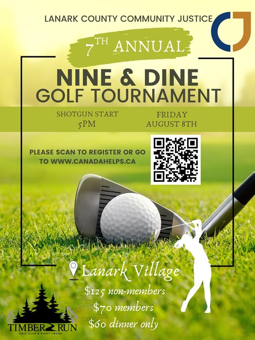 This year, Community Justice celebrates its 25th anniversary of providing restorative justice services. The Tickets will be on sale from July 3rd to August 4th! Join us for the 7th Annual Nine and Dine – a fun-filled 9-hole shotgun golf tournament! The event will take place on Friday, August 8th at the Timber Run Golf Club, with a 5 PM shotgun tee-off. Register: https://www.canadahelps.org/en/charities/lanark-county-community-justice-program-inc/events/7th-annual-nine-and-dine-golf-tournament/ 5 PM shotgun tee-off Tickets are priced at: $125 for non-members (includes golf and dinner), $70 for members, and; $60 for dinner only. Proceeds support Lanark County Community Justice. Don’t miss out on this exciting evening of golf, dining, and community spirit! We hope you will consider being a part of this important fundraiser. Support from retailors and businesses in Lanark County is critical to our success. To continue to deliver our core programming, we must raise about 30% of our total budget through fundraising and this Nine & Dine is a key fundraiser. Our vision is that we all live, work and play in a community that embraces restorative practices to repair harm, build community connections and strengthen relationships. (fb)