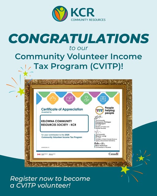 Our amazing Community Volunteer Income Tax Program (CVITP) volunteers filed 889 tax returns this past 2024-2025 season! We are so appreciative to our CVITP volunteers for giving their time and skills to help people in our community get their taxes filed every year. Thank you as well to the Canada Revenue Agency for their support of this program and their recognition of our volunteers. With the new tax season upcoming, volunteer registration is now open if you’d like to give back to the community by volunteering with our CVITP. No prior tax software expertise is required- we will provide training and job shadowing! Check out the VolunteerConnector posting here: https://www.volunteerconnector.org/kelowna/kcr-community-resources/tax-clinic-support-volunteer-kelowna-based (fb)