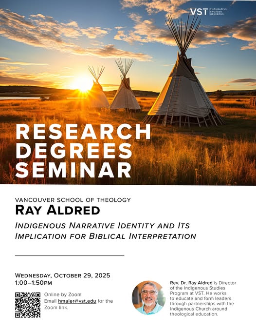 This Wednesday, Professor Ray Aldred will give a talk entitled “Indigenous Narrative Identity and Its Implication for Biblical Interpretation.” The Research Degrees Seminar will take place on Zoom, Wednesday, October 29, from 1:00–1:50 PM. For access to the Zoom link, please contact Prof. Harry Maier. We hope to see you there! (fb)