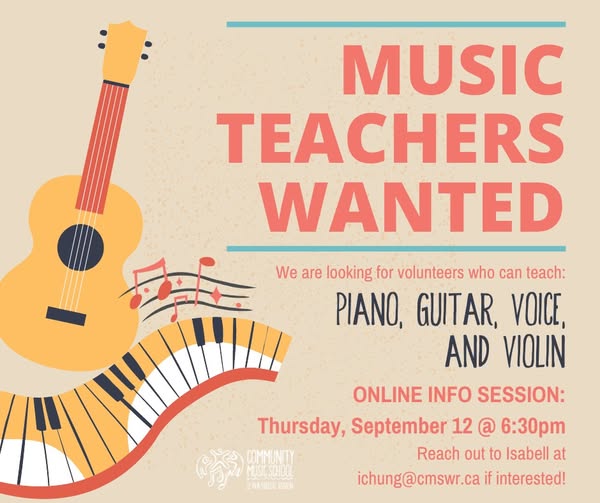 CMSWR is looking for for volunteers to teach piano, guitar, voice, and violin lessons! We need teachers for the following times/locations: 🎻 Tuesdays, 4:30pm-6:30pm at The St. Matthew's Centre (54 Benton St, Kitchener) 🎸 Saturdays, 11:30am-1:30pm at Martin Luther University College Prior teaching experience isn't required - just a willingness to learn and invest in our students. CMSWR provides mentorship, training, and professional development opportunities for our volunteer teachers. We have an online info session happening Thursday, September 12th at 6:30pm. Reach out to Isabell at ichung@cmswr.ca if you'd like to attend and learn more about CMSWR. (fb)