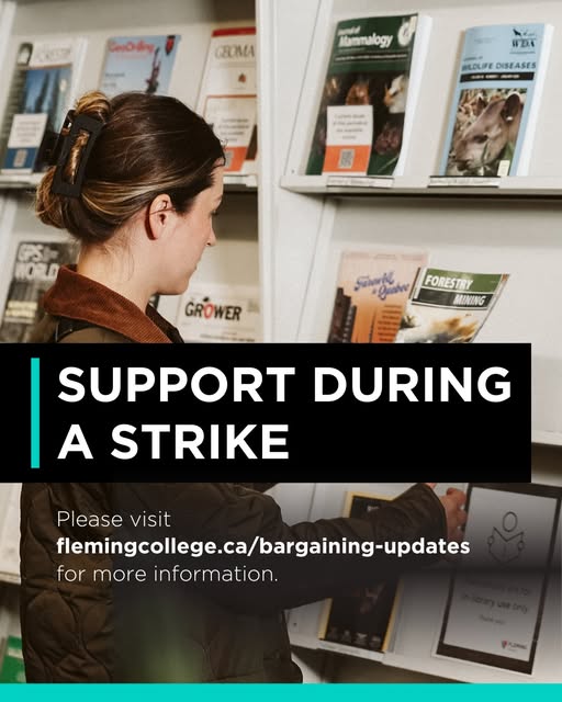 The striking employees work in roles such as office, clerical, technical, student services, health care, maintenance, building service, shipping, transportation, and academic technologists. This means some areas, including the registrar’s office and student services, may experience delays or reduced availability. Here’s what services are available during the strike: Open (with some adjustments): Service Hub, OneCard, Parking/Locking, Campus Store, Food Services, Housing, IT Services (virtual only), Registrar’s Office (delays possible), Counselling, Accessible Education, Health Services, Academic Upgrading, Athletics & Recreation, Student Life (Peer Mentors), Tutoring, Library, Indigenous Student Services & Lounge. Suspended: Career Services, Academic Upgrading support, Indigenous Education Council, Student Success advising, Registrar’s Office diploma mailing, bursary processing, refunds, and student worker eligibility. Check flemingcollege.ca/bargaining-updates for the latest info. (fb)