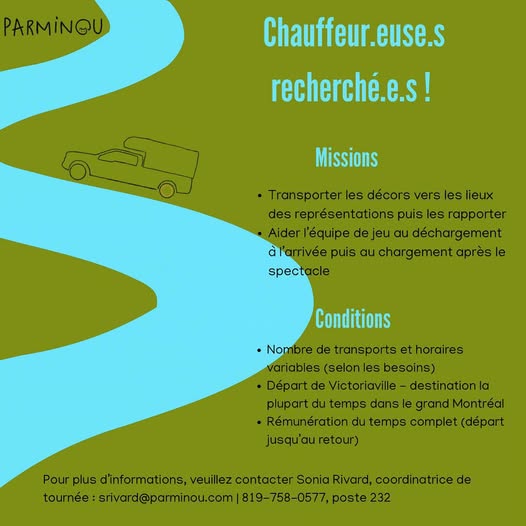 Lequipe cONTACTEz NOTRE EQUIPE Spectacles Decouvrez nos spectacles Le parminou Faites notre connaissance thetre de creation Creez avec nous Soireebenefice 50 ans dhistoire Decouvrir Histoires en chemin etait au Parminou . Hier le Parminou a eu le plaisir de presenter en ses lieux deux representations dHistoires en chemin. Il sagissait des 22me et 23me representations de cette pice sur 51. En lire plus LE RETOUR DU CABARETTHETRE A loccasion de notre 50e anniversaire nous organisons une nouvelle formule de CabaretThetre.