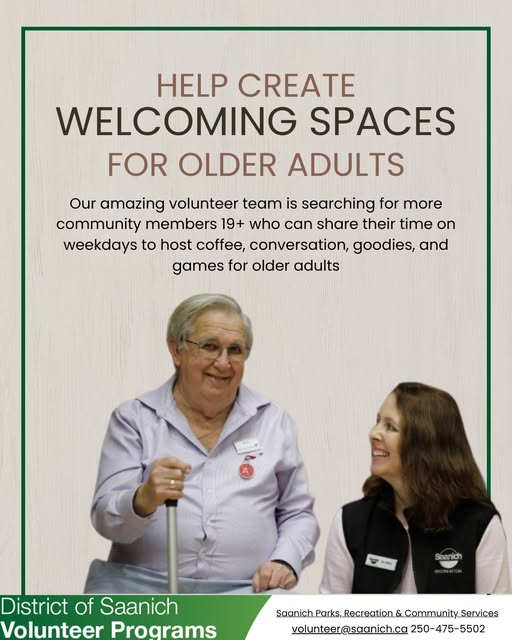 District of Saanich Parks, Recreation and Community Services is looking for volunteers! Saanich Parks, Recreation & Community Services "Help create welcoming spaces in Saanich Recreation Centres for older adults to connect over coffee, conversation, goodies, and games! Our amazing volunteer team is searching for more community members 19+ who can share their time on weekdays and are willing to complete a Police Information Check. For more info, contact Lindsay (volunteer@saanich.ca or 250-475-5502)." https://bttr.im/2z30w (fb)