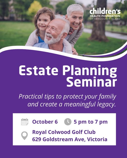 Did you know estate planning can be simple? Join our free Estate Planning Seminar and learn how to avoid common pitfalls, protect your family’s future, and make confident decisions about your legacy. Our expert panel will share practical advice on wills and estate planning, along with insights on charitable giving and how you can create a lasting impact. 📅 October 6 at 5 pm 📍 Royal Colwood Golf Club 🌐Save your spot today: https://lp.constantcontactpages.com/ev/reg/xqwufnh #IslandKidsFirst #EstatePlanning #LegacyGiving (fb)