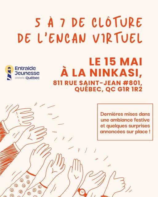 Il ne vous reste que 3 jours pour miser sur vos lots favoris sur la plateforme de l'encan virtuel (https://www.macause.com/ejq)! Afin de clore notre événement en beauté, nous vous invitons à la Ninkasi (811 Rue Saint-Jean #801, Québec, QC G1R 1R2) pour un 5 à 7 de clôture de l'encan virtuel. On vous promet une ambiance festive et quelques surprises annoncées sur place. Vous pourrez aussi repartir avec vos prix suite à la fermeture des mises. C'est un rendez-vous à ne pas manquer ! Signifiez votre intérêt dans l'événement suivant afin que nous puissions estimer le nombre de personnes qui seront sur place : https://www.facebook.com/share/16GYshPfLk/ (fb)