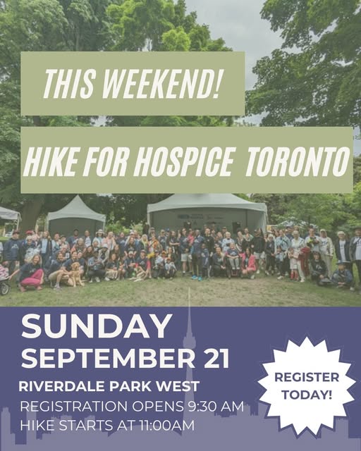 ⏳ The wait is almost over – the Hike for Hospice Toronto is happening this Sunday, September 21 at Riverdale Park West! We’re excited to gather together to support families in our community who rely on compassionate hospice care. 📍 Location: Riverdale Park West 🕘 Registration & check-in: 9:30AM | Hike begins: 11:00AM 👟 What to bring: walking shoes, water, and your team spirit! It’s not too late to get involved – sign up, create a team, or donate today. Every step we take helps ensure families receive care with comfort and dignity. 👉 Register or donate: https://hospicetoronto.ca/event/23rd-annual-hike-for-hospice-sep-21-2025/?utm_source=google&utm_medium=native&utm_campaign=hikeforhospice #Hike4HospiceTO (fb)