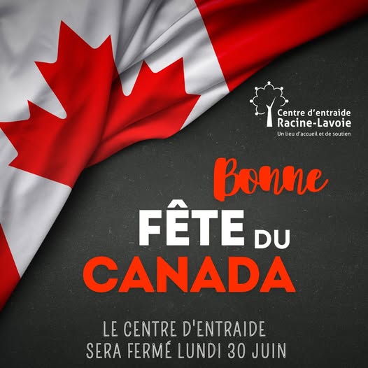 Bonne fête du Canada ! 🇨🇦 Le Centre d’entraide Racine-Lavoie souhaite à toute la communauté une belle journée de célébration, de partage et de solidarité. Profitons de cette occasion pour souligner la diversité, l’entraide et l’engagement qui nous unissent chaque jour. Bonne fête à toutes et à tous ! Veuillez noter que le Centre d’entraide sera fermé le lundi 30 juin 🇨🇦 #CongéFêteCanada (fb)